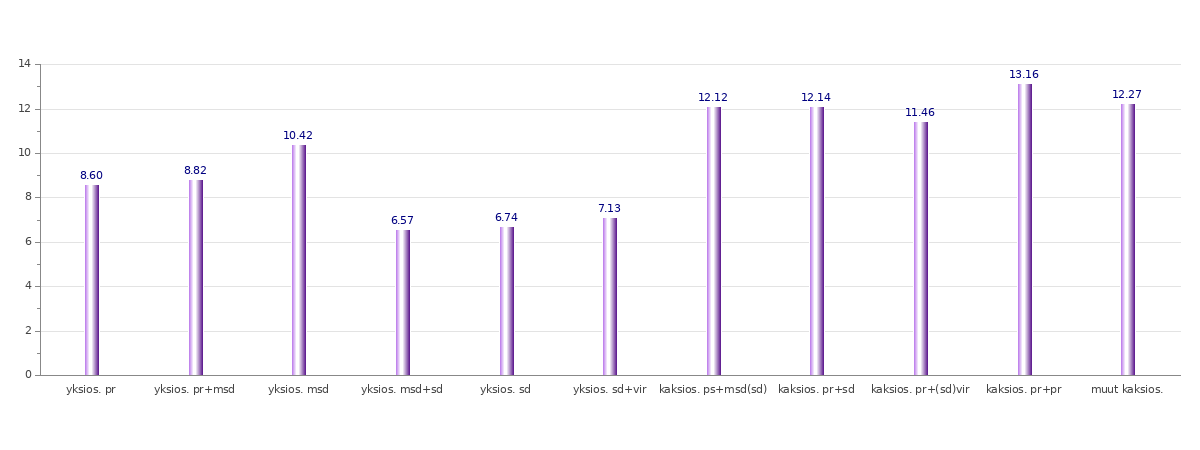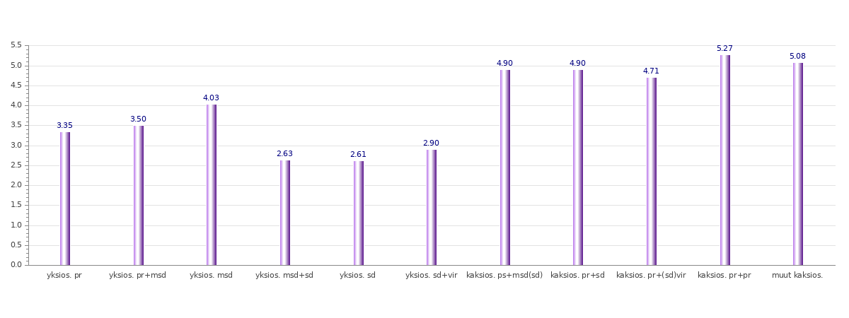 Seuraavassa graafissa esitetään nimenosien keskipituudet tavuina rakennetyypeittäin. Kyseessä on siis eräänlainen koonti edellisistä graafeista. Tämän graafin mukaan lisämerkityksiset sekundäärinimenosat ovat pisimpiä sekundäärien ja virallisten nimenosien jäädessä keskiarvon alapuolelle. Kuten pylväs msd (ei bakr.) osoittaa, lisämerkityksiset sekundäärinimet ovat kuitenkin lähes keskimääräisen pituisia, kun usein monitavuiset bakronyymit jätetään huomiotta. Se, että lisämerkityksiset sekundäärinimet kuitenkin ovat pitempiä kuin puhtaat sekundäärinimet, on myös ymmärrettävissä, kun huomioidaan, että puhdasta sekundäärinimeä muodostettaessa pyritään usein helpottamaan ääntämystä ja rakennetta, kun taas lisämerkityksistä sekundäärinimeä muodostettaessa ilmausta pyritään kompleksistamaan vaihtamalla ja lisäämällä ainesta lisämerkityksen saavuttamiseksi. Myös virallisten nimenosien lyhyys on käsitettävissä, sillä viralliset nimet ovat tässä tutkimuksessa mahdollisia ainoastaan epävirallisen nimen osina. Näin kaikki viralliset nimet ovat kaksiosaisen nimen osia, kun muissa ryhmissä on puolestaan myös pitempiä metaforisluonteisia ilmauksia. Lisäksi lienee niin, että päätyäkseen epävirallisen nimen osaksi muokkaamattomana virallisen nimen on pitänyt jo valmiiksi olla lyhyt, fonotaktisesti ainakin lähes suomalainen ja näin mieluiten kaksitavuinen.