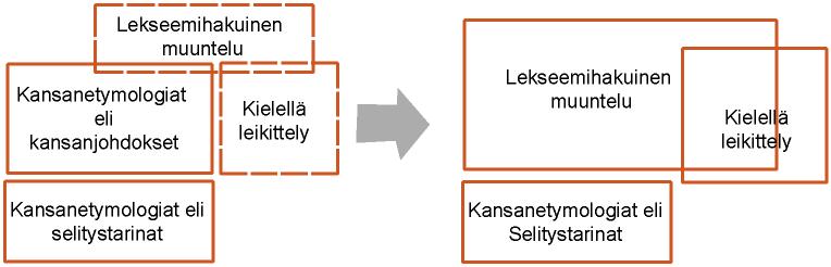 Näkemykseni mukaan termi kansanetymologia on negatiivisesti värittynyt ja kansan harhakuvitelmiin tai ymmärtämättömyyteen viittaava. Koska nimien ja sanojen suhteen meillä ei juuri koskaan ole pääsyä nimenmuokkaajan tai lainaajan motiiveihin, emme pysty arvioimaan sitä, onko lekseemihakuisen muuntelun motiivi kyvyttömyys, humoristisuus vai peräti halu yksinkertaistaa asioita tai tehdä sanasta tarkoitettaan paremmin kuvaava. Termi kansanetymologia tulisikin johdonmukaisuuden vuoksi vastedes varata vain selityksille tai selitystarinoille (näin esim. NP 2008: 35 sekä Nissilä 1962:99 ss. ja Nissilä 1975:287–290). Onkin viisainta tyytyä puhumaan lekseemihakuisesta mukailusta tai muuntelusta niin rastaana olemisen kuin kulkineennimienkin muuntelun suhteen. Näin päästään eroon myös siitä seikasta, että kansanetymologia merkitsee oikeastaan kahta eri asiaa: sekä selitystarinaa että sellaisia sana- tai nimimuotoja, joita Nissilä nimitti kansanjohdoksiksi. Näkemykseni mukaan terminologinen kenttä tulisi jäsentää seuraavalla tavalla uudelleen: