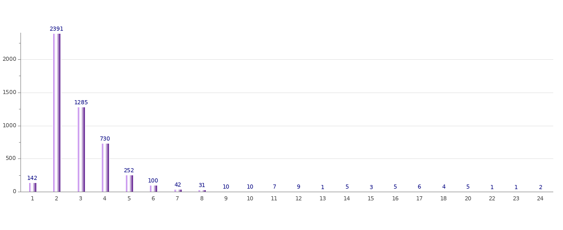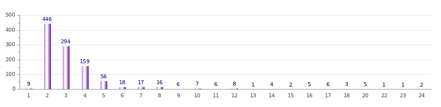 Ensimmäisessä graafissa esitetään, montako minkäkin pituista nimenosaa aineistossa on. Noin puolet nimenosista on suomen kielelle ominaiseen tapaan kaksitavuisia, mutta kolmi- ja neliosaisiakin on jonkin verran. Erityisen pitkät nimenosat kuuluvat sellaisille bakronyyminimille, jotka on yksiosaisen virallisen nimen johdannaisina luokiteltu yksiosaisiksi.