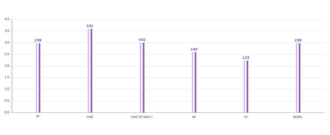 Seuraavassa graafissa esitetään nimenosien keskipituudet tavuina rakennetyypeittäin. Kyseessä on siis eräänlainen koonti edellisistä graafeista. Tämän graafin mukaan lisämerkityksiset sekundäärinimenosat ovat pisimpiä sekundäärien ja virallisten nimenosien jäädessä keskiarvon alapuolelle. Kuten pylväs msd (ei bakr.) osoittaa, lisämerkityksiset sekundäärinimet ovat kuitenkin lähes keskimääräisen pituisia, kun usein monitavuiset bakronyymit jätetään huomiotta. Se, että lisämerkityksiset sekundäärinimet kuitenkin ovat pitempiä kuin puhtaat sekundäärinimet, on myös ymmärrettävissä, kun huomioidaan, että puhdasta sekundäärinimeä muodostettaessa pyritään usein helpottamaan ääntämystä ja rakennetta, kun taas lisämerkityksistä sekundäärinimeä muodostettaessa ilmausta pyritään kompleksistamaan vaihtamalla ja lisäämällä ainesta lisämerkityksen saavuttamiseksi. Myös virallisten nimenosien lyhyys on käsitettävissä, sillä viralliset nimet ovat tässä tutkimuksessa mahdollisia ainoastaan epävirallisen nimen osina. Näin kaikki viralliset nimet ovat kaksiosaisen nimen osia, kun muissa ryhmissä on puolestaan myös pitempiä metaforisluonteisia ilmauksia. Lisäksi lienee niin, että päätyäkseen epävirallisen nimen osaksi muokkaamattomana virallisen nimen on pitänyt jo valmiiksi olla lyhyt, fonotaktisesti ainakin lähes suomalainen ja näin mieluiten kaksitavuinen.